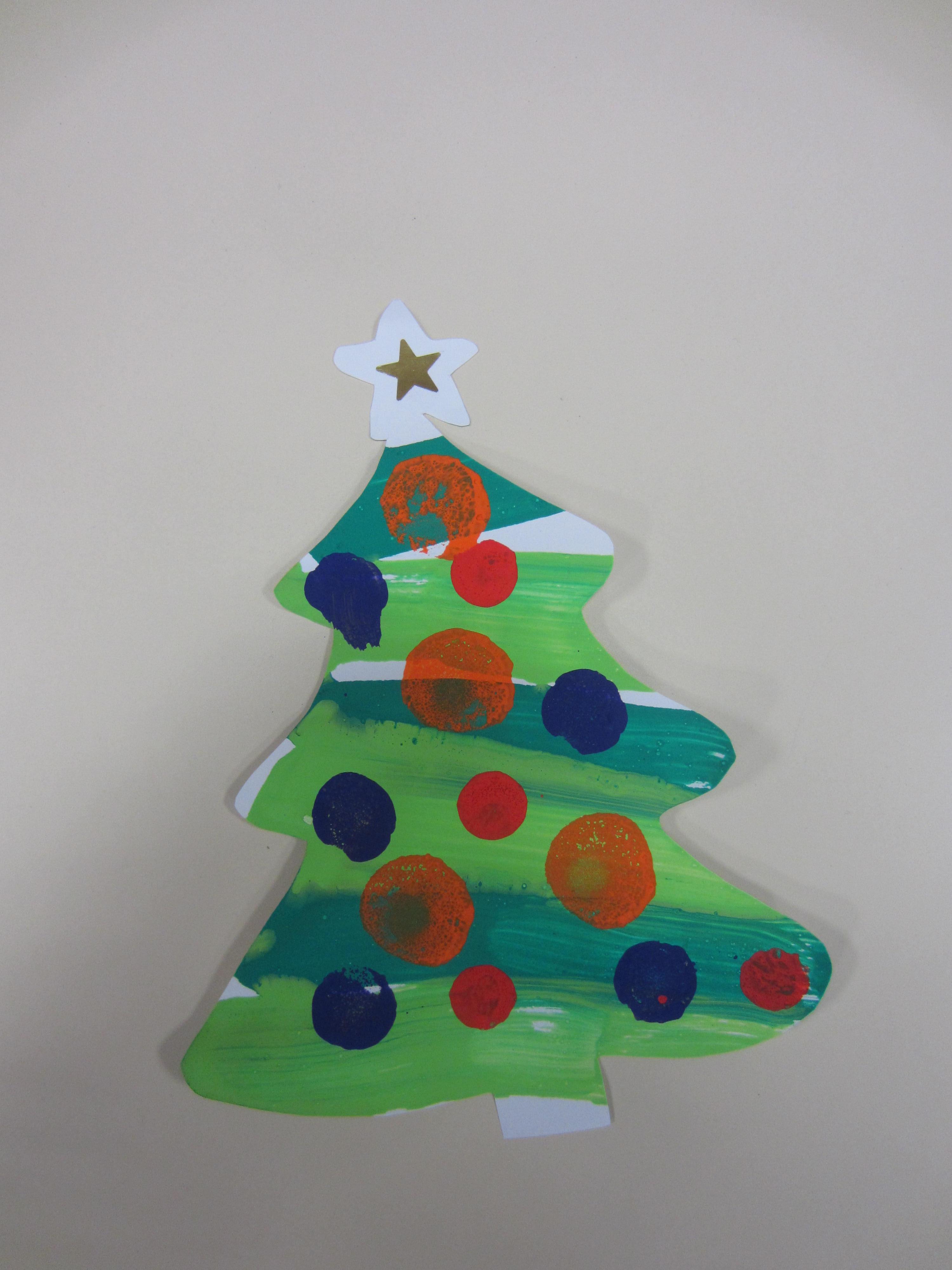 Je trace des traits horizontaux avec de la peinture verte (2 nuances) et ensuite je décore mon sapin en réalisant des empreintes de tampons ronds pour les boules