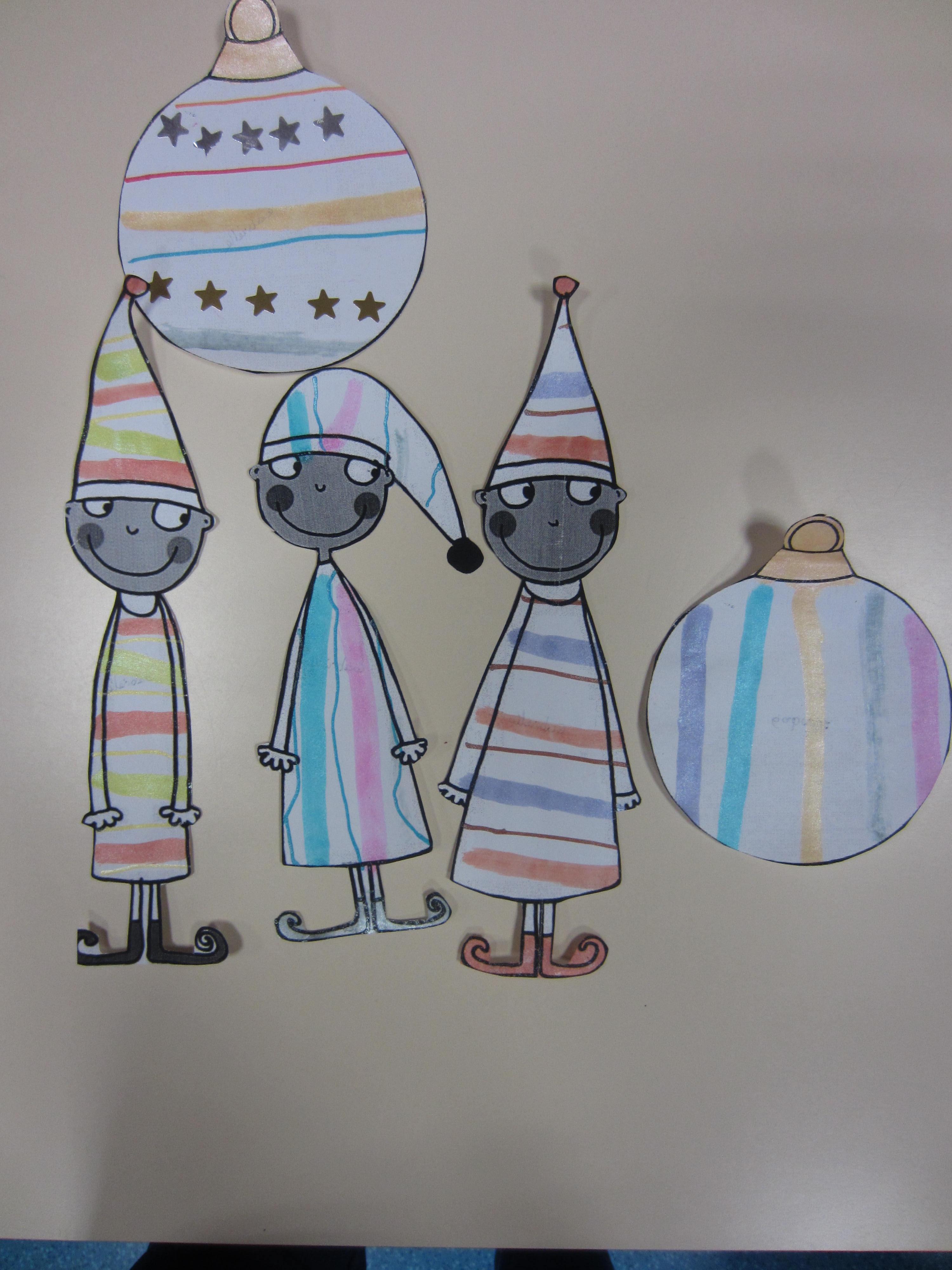 Je décore des boules et des lutins du père noël en réalisant des traits verticaux et horizontaux.