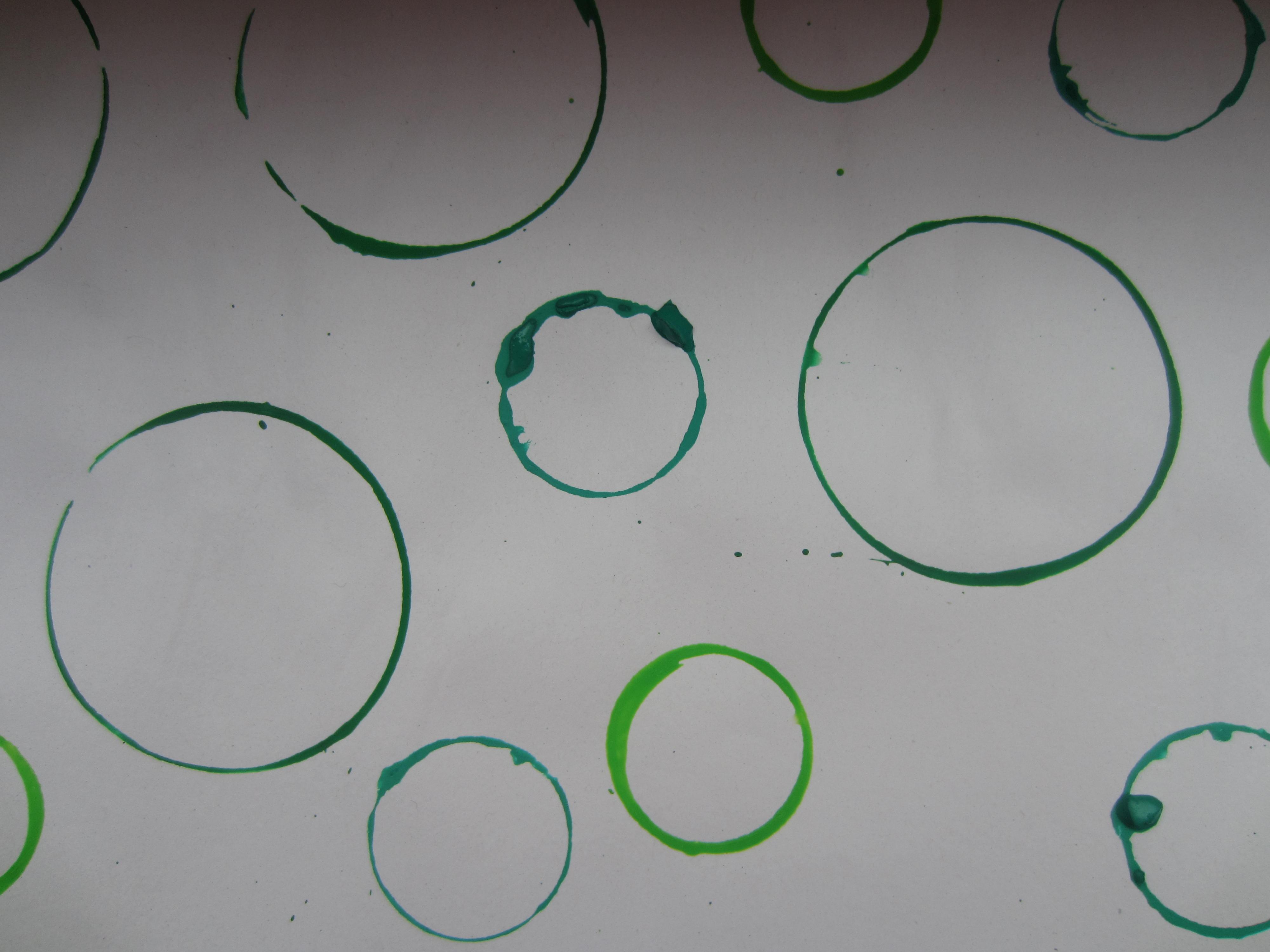 Je décore ma feuille avec des empreintes d'objets ronds de 3 tailles différentes et de 3 couleurs différentes en verbalisant la taille utilisée.
